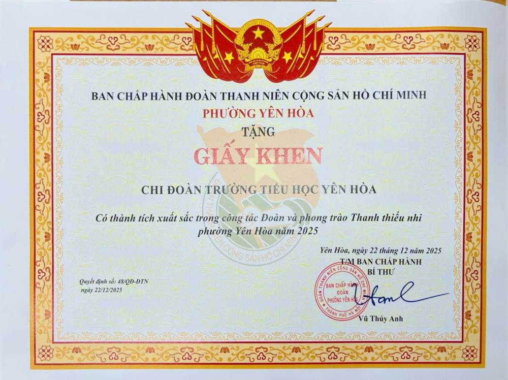 Hoà trong không khí thi đua sôi nổi của tuổi trẻ địa phương, Chi đoàn Trường Tiểu học Yên Hoà vừa vinh dự được Đoàn phường Yên Hoà trao tặng Giấy khen vì đã có nhiều thành tích tiêu biểu, xuất sắc trong công tác Đoàn và phong trào thanh thiếu nhi năm 2025.