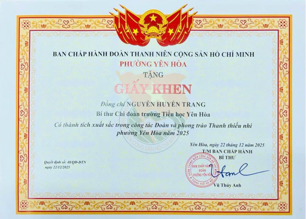 Cùng với thành tích chung của tập thể nhà trường, đồng chí Nguyễn Thị Huyền Trang – Bí thư Chi đoàn Trường Tiểu học Yên Hoà cũng vinh dự nhận Giấy khen cá nhân từ Đoàn phường. Phần thưởng này là sự ghi nhận xứng đáng cho tinh thần trách nhiệm, sự nhiệt huyết, chủ động và sáng tạo của đồng chí trong công tác lãnh đạo, tổ chức và triển khai hiệu quả các hoạt động Đoàn tại đơn vị.