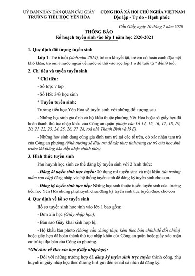 Năm học 2020 - 2021 đã chính thức bắt đầu. Tuy dịch bệnh Covid vẫn chưa hoàn toàn được dập tắt, khó khăn, thử thách vẫn còn trước mắt, nhưng bằng tất cả sự nỗ lực, quyết tâm, của thầy trò nhà trường, sự quan tâm sát sao của gia đình cùng sự giúp đỡ, hỗ trợ của các cấp đoàn thể, chúng ta hoàn toàn có quyền tin tưởng và chờ đợi một năm học nhiều thành công và thắng lợi của thầy và trò trường Tiểu học Yên Hoà.