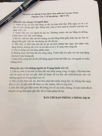 Dưới đây là khuyến cáo chung với người dân, khuyến cáo với những người từ Trung Quốc trở về của Bộ Y tế để phòng chống dịch viêm đường hô hấp cấp do chủng mới của virus corona (nCoV).