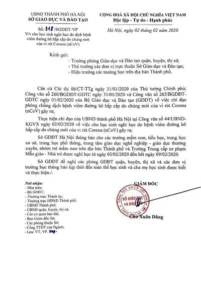 UBND Thành phố Hà Nội vừa có quyết định cho học sinh nghỉ học phòng, tránh dịch bệnh do virus corona, thời gian nghỉ từ ngày 3/2/2020 đến hết 9/2/2020.