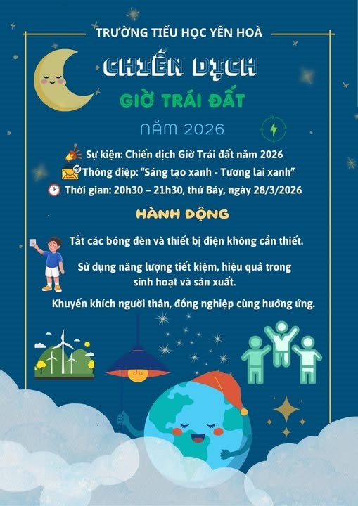 "Tắt đèn - Bật tương lai" chính là thông điệp ý nghĩa mà thầy và trò trường Tiểu học Yên Hoà cùng nhau lan tỏa trong ngày hôm nay. Không chỉ là 60 phút tắt đi những thiết bị điện không cần thiết, đây còn là dịp để chúng ta cùng nhìn lại và nâng cao ý thức bảo vệ ngôi nhà chung xanh - sạch - đẹp.
