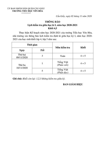 Thực hiện Kế hoạch năm học 2021 - 2022 của trường Tiểu học Yên Hòa, nhà trường thông báo lịch kiểm tra định kì giữa học kì II năm học 2021 - 2022, cụ thể như sau: