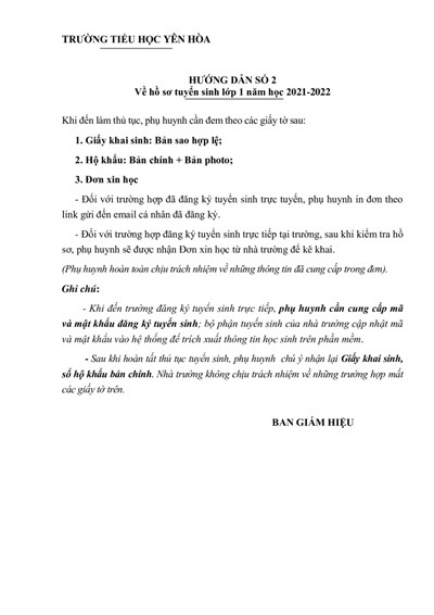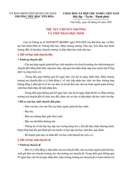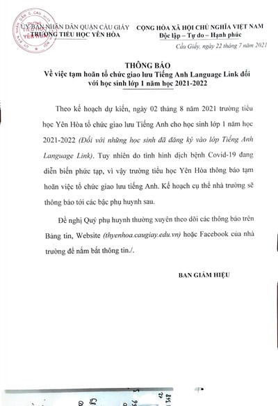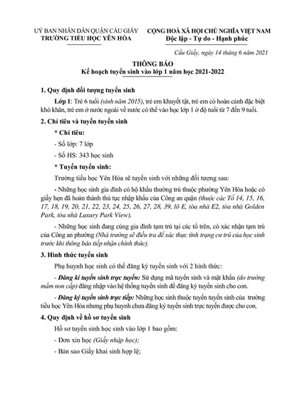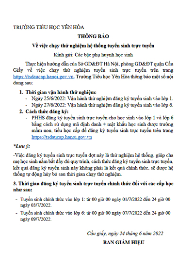 https://tsdaucap.hanoi.gov.vn. Trường Tiểu học Yên Hòa thông báo một số nội