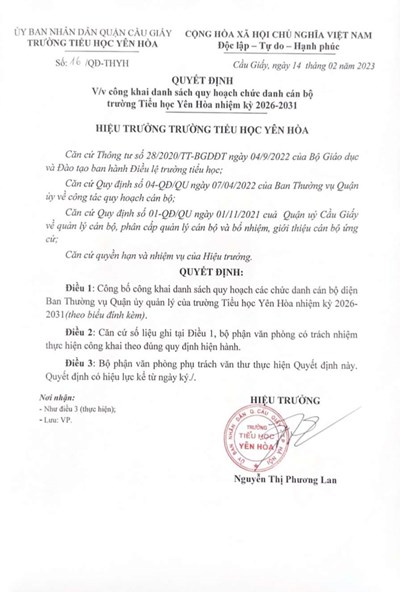 V/v công khai danh sách quy hoạch chức năng cán bộ trường Tiểu học Yên Hoà nhiệm kỳ 2026-2031