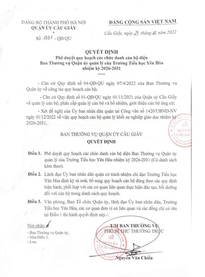 Phê duyệt quy hoạch các chức danh cán bộ diện Ban Thường vụ Quận uỷ quản lý của Trường Tiểu học Yên Hoà