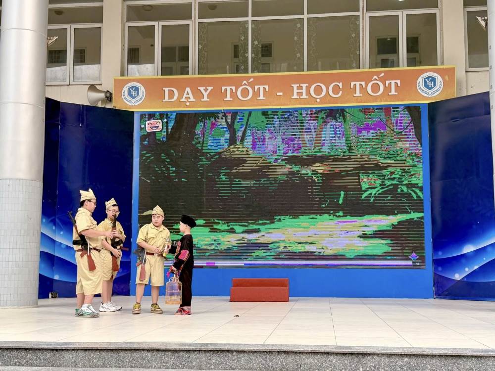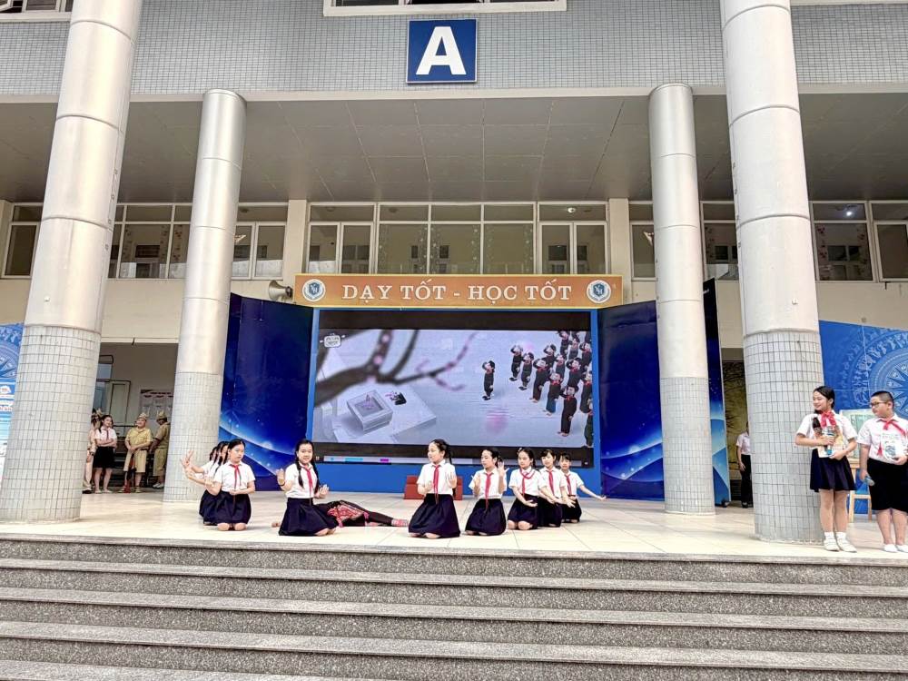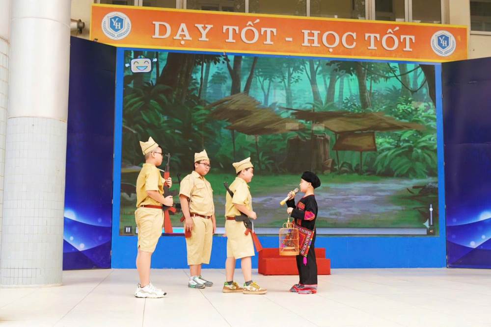 Đặc biệt, chương trình đã để lại dấu ấn sâu sắc với tiết mục sân khấu hóa “Hoạt cảnh Anh Kim Đồng – người thiếu niên dũng cảm” do các bạn học sinh khối 4 biểu diễn. Tiết mục không chỉ tái hiện hình ảnh anh hùng nhỏ tuổi Kim Đồng mà còn góp phần giáo dục truyền thống yêu nước, lòng dũng cảm và tinh thần trách nhiệm cho các em học sinh.