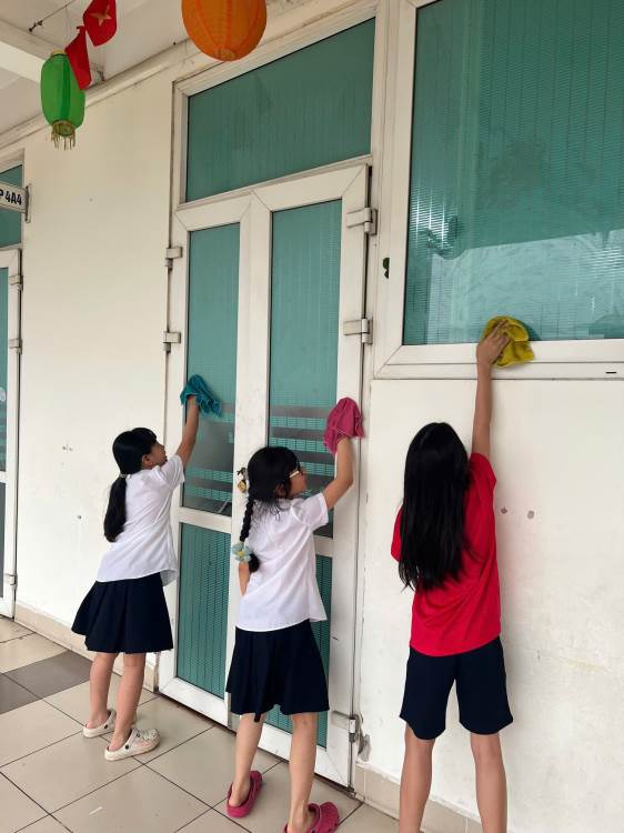 Bên cạnh chiến dịch tổng vệ sinh định kì, công tác giữ gìn cảnh quan hàng ngày cũng luôn được chú trọng. Đội ngũ nhân viên vệ sinh của nhà trường vẫn miệt mài làm việc, đảm bảo các khu hành lang, phòng chức năng và khuôn viên chung luôn trong trạng thái sạch đẹp, thoáng mát.