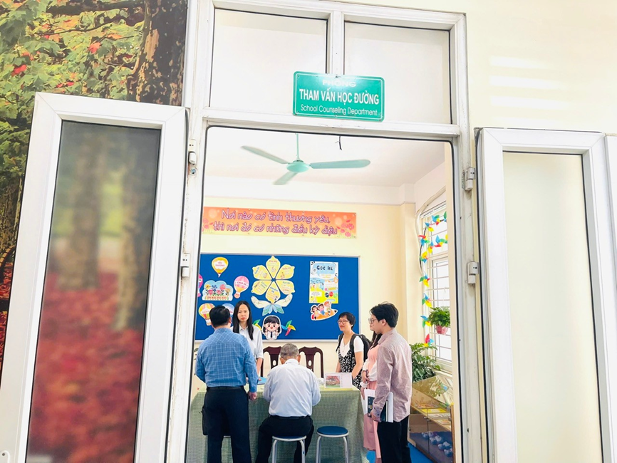 Sau khi giới thiệu và thông qua lịch làm việc, Đoàn khảo sát đã lắng nghe nhà trường báo cáo về việc triển khai thực hiện các chương trình, đề án của Thủ tướng Chính phủ về y tế trường học và chăm sóc sức khỏe trẻ em, học sinh giai đoạn 2019 – 2025. Tiếp đó, các chuyên gia đã tiến hành phỏng vấn sâu đối với Giám hiệu và cán bộ y tế học đường về việc triển khai các nội dung như: khám sức khỏe định kỳ, dinh dưỡng học đường, phòng chống dịch bệnh, truyền thông nâng cao nhận thức sức khỏe cho học sinh,… và điều hành Thảo luận nhóm với đại diện giáo viên trong trường về những thuận lợi, khó khăn, đề xuất kiến nghị thực tế trong quá trình triển khai các chương trình, đề án. Buổi làm việc đã diễn ra trong không khí khẩn trương, nghiêm túc với tinh thần chia sẻ cởi mở, ghi nhận nhiều ý kiến thiết thực và những sáng kiến sáng tạo của đội ngũ cán bộ, giáo viên, nhân viên tham gia phỏng vấn và thảo luận.