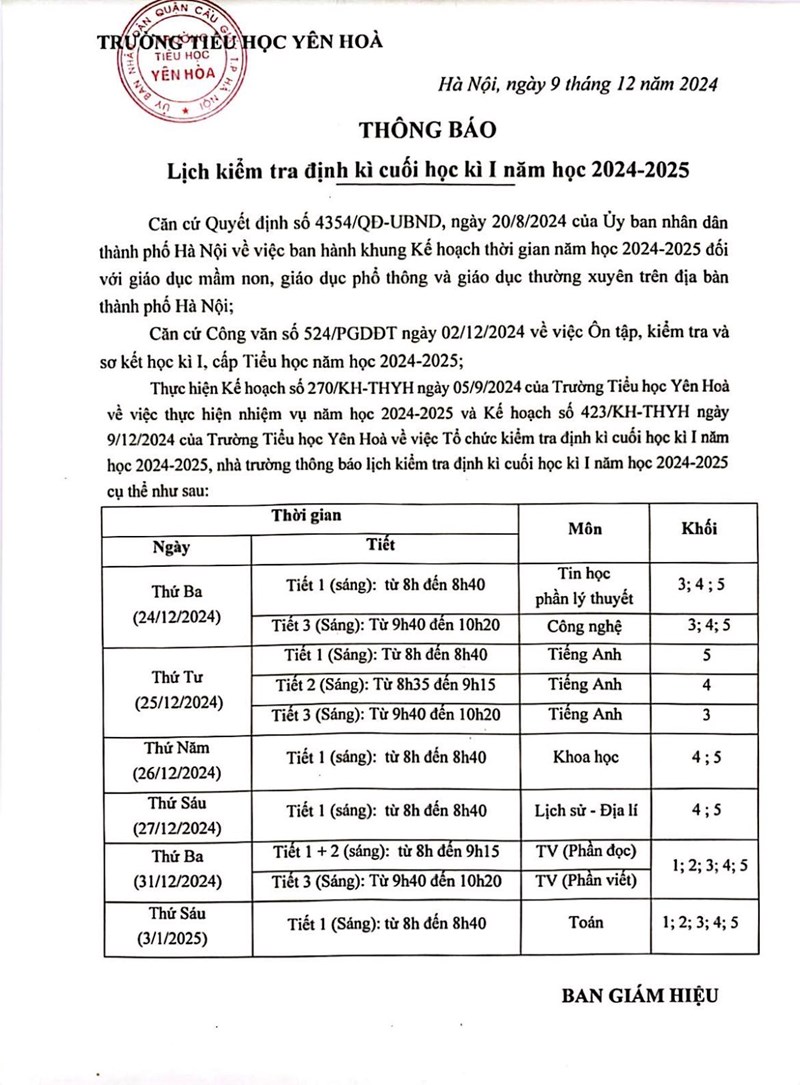 Trường Tiểu học Yên Hoà trân trọng thông báo tới Quý phụ huynh và các em học sinh lịch nghỉ Tết Dương lịch năm 2026 như sau: