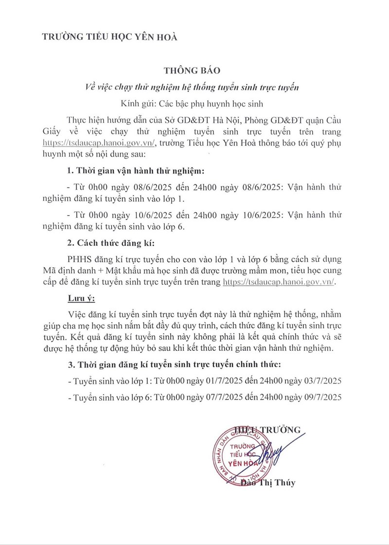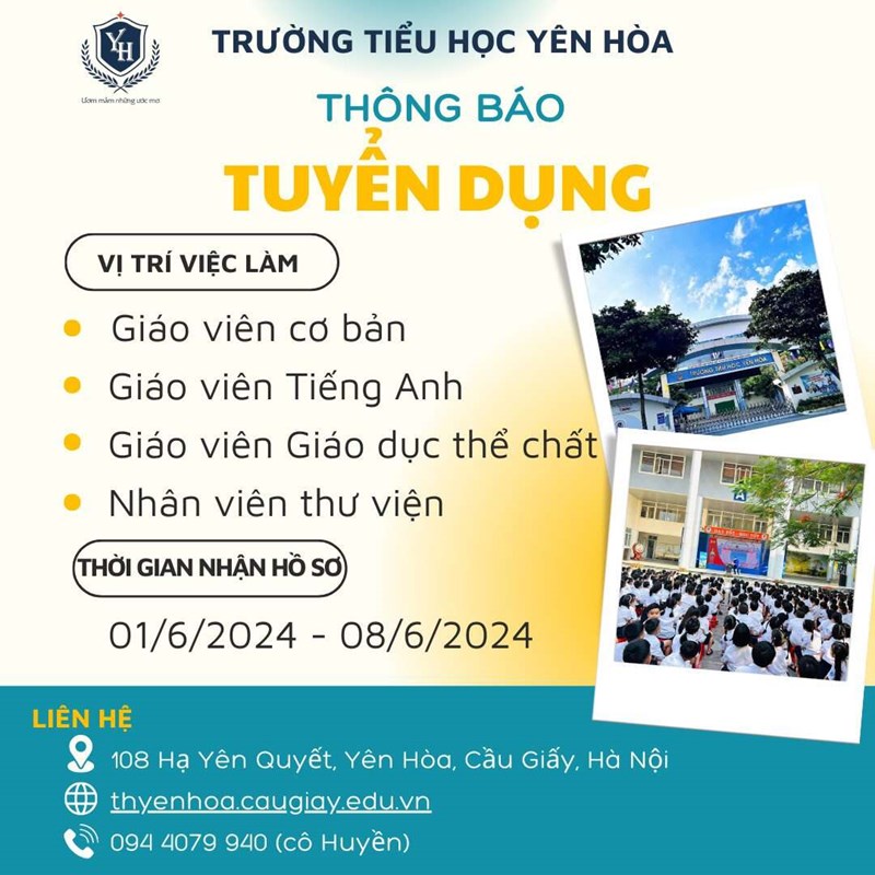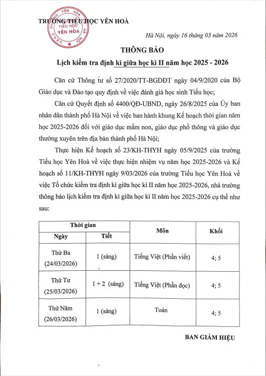 Trường Tiểu học Yên Hòa thông báo Lịch nghỉ lễ Giỗ Tổ Hùng Vương 2024