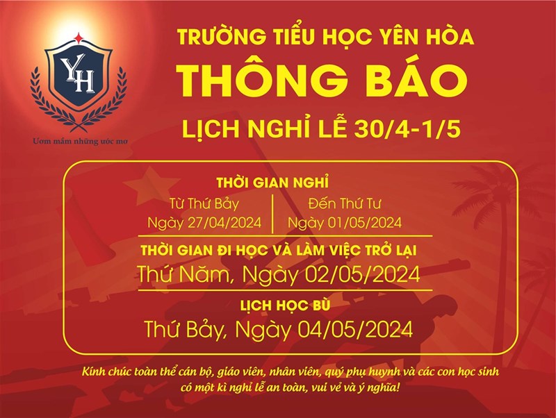Trường Tiểu học Yên Hoà trân trọng thông báo Lịch nghỉ lễ 30/4 - 1/5.