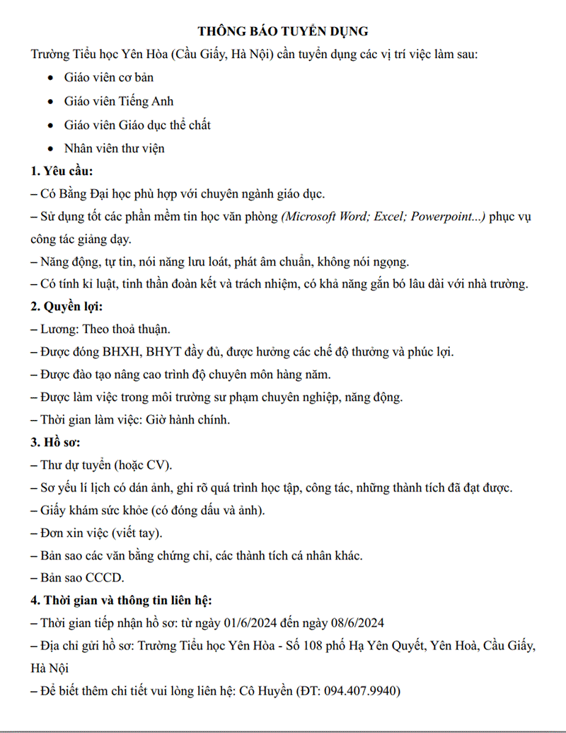 THÔNG BÁO v/v Tuyển dụng giáo viên, nhân viên