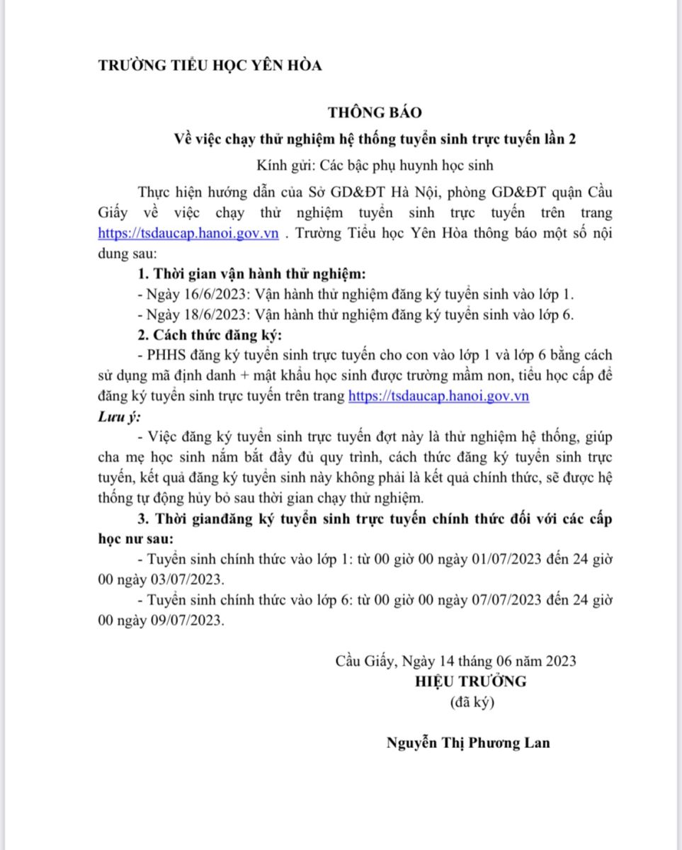 Trường Tiểu học Yên Hoà thông báo về việc chạy thử nghiệm hệ thống tuyển sinh trực tuyến lần 2 năm học 2023-2024.