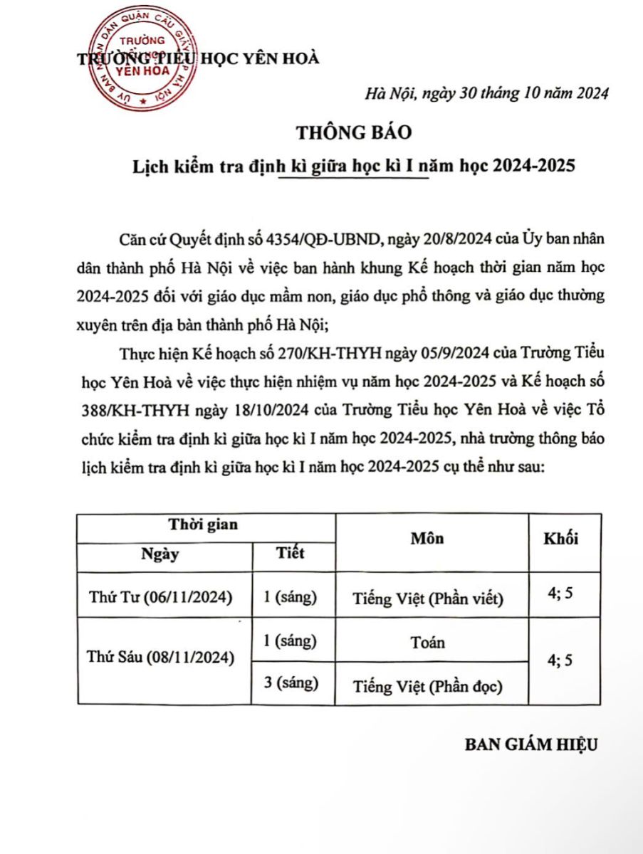 Lịch kiểm tra định kì giữa học kì I năm học 2024-2025