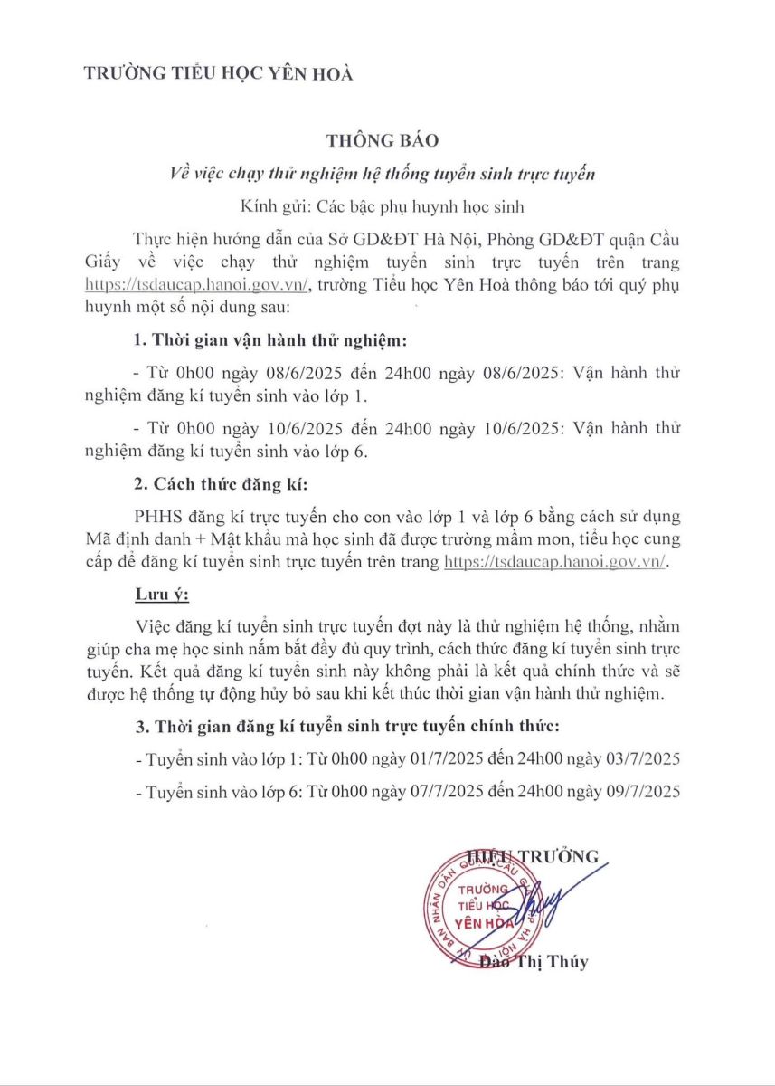 Trường Tiểu học Yên Hoà thông báo v/v chạy thử nghiệm hệ thống tuyển sinh trực tuyến lần 1; Lịch tuyển sinh trực tuyến chính thức đối với HS lớp 1 và HS lớp 6 - Năm học 2025 - 2026.