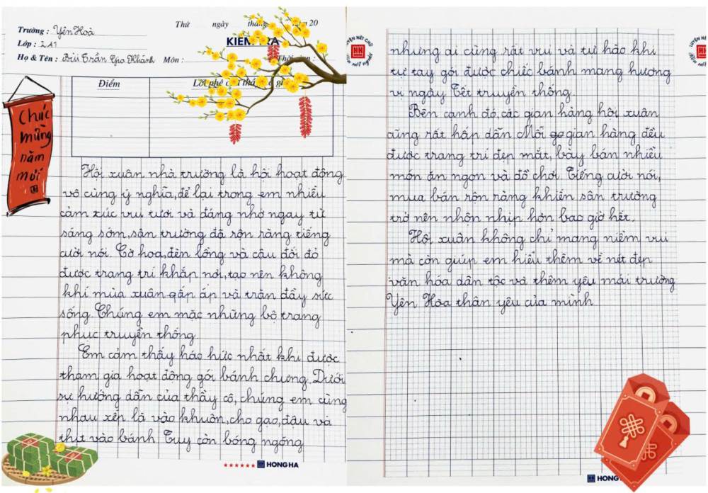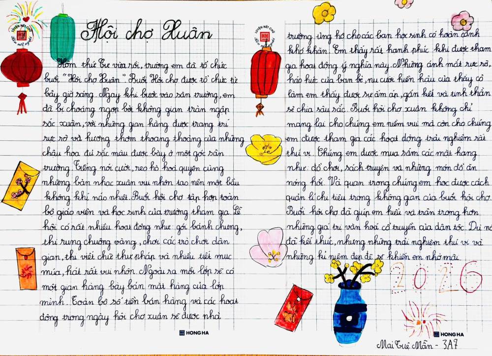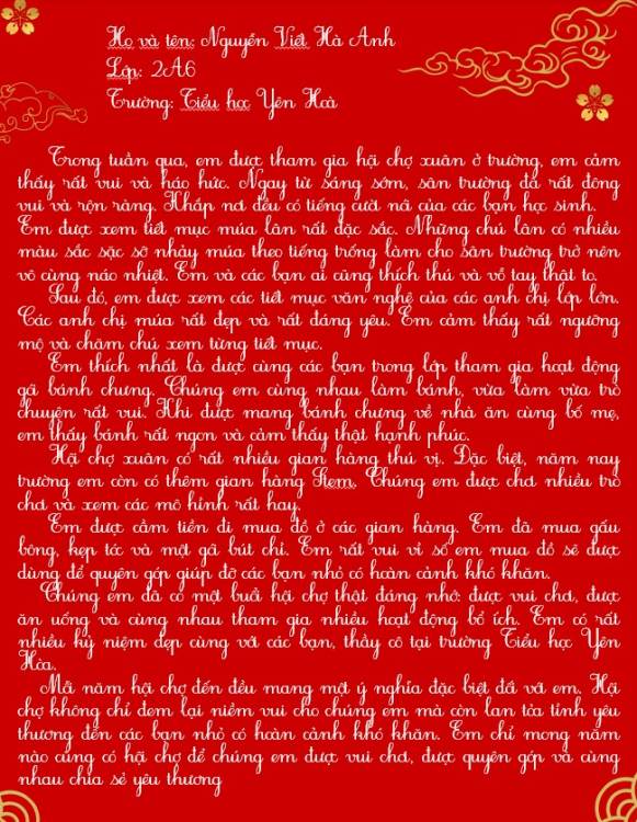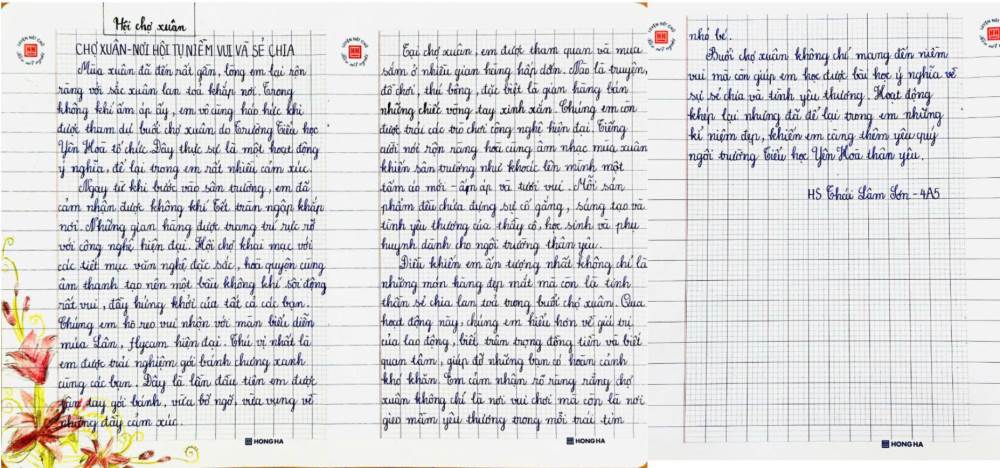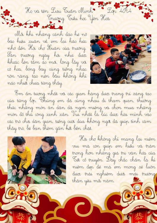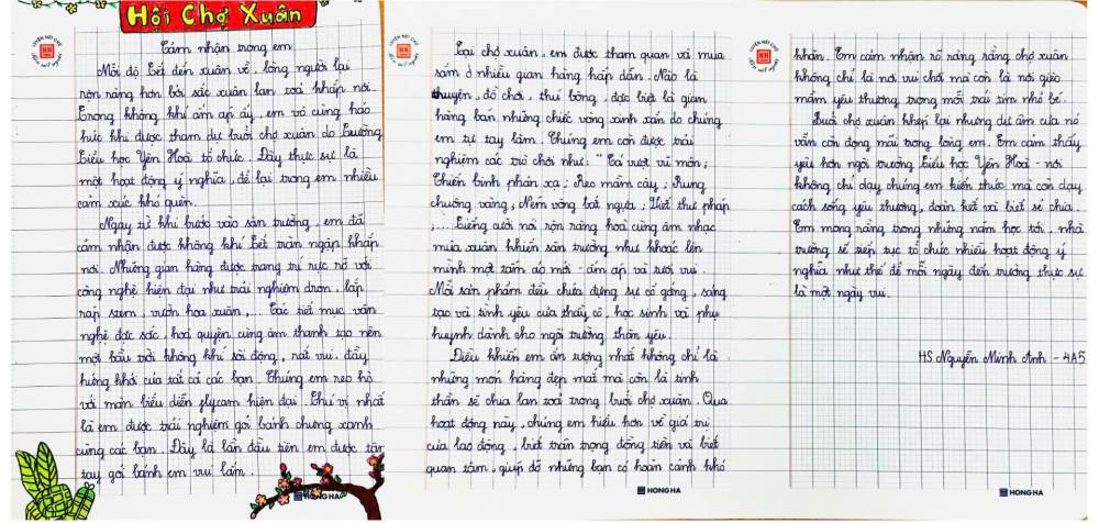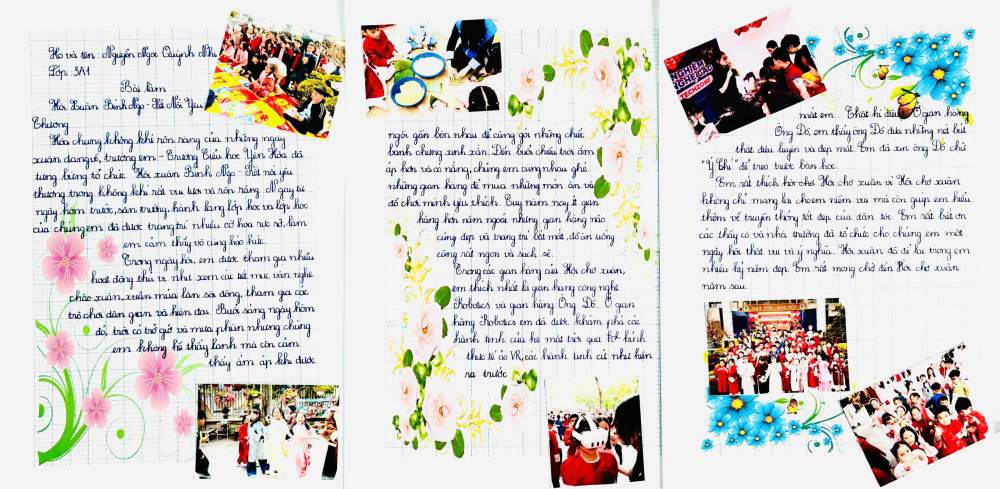 Sau hội xuân, các bạn học sinh đã viết lại những cảm xúc của mình bằng những lời văn hồn nhiên, trong sáng và rất đáng yêu. Mỗi bài viết là một mảnh ghép nhỏ, kể về niềm vui khi tham gia trò chơi dân gian, xem văn nghệ, ghé thăm các gian hàng và cùng bạn bè, thầy cô tận hưởng một ngày xuân thật đặc biệt.