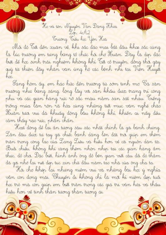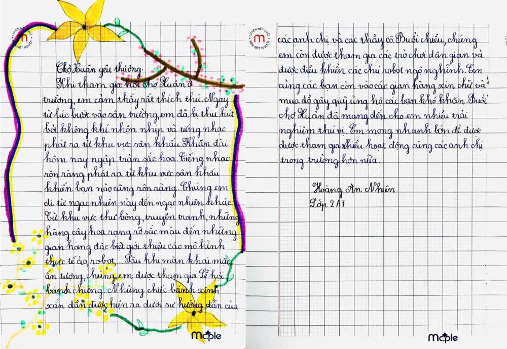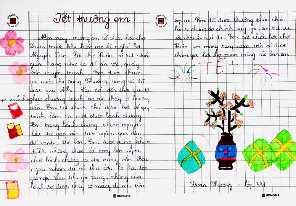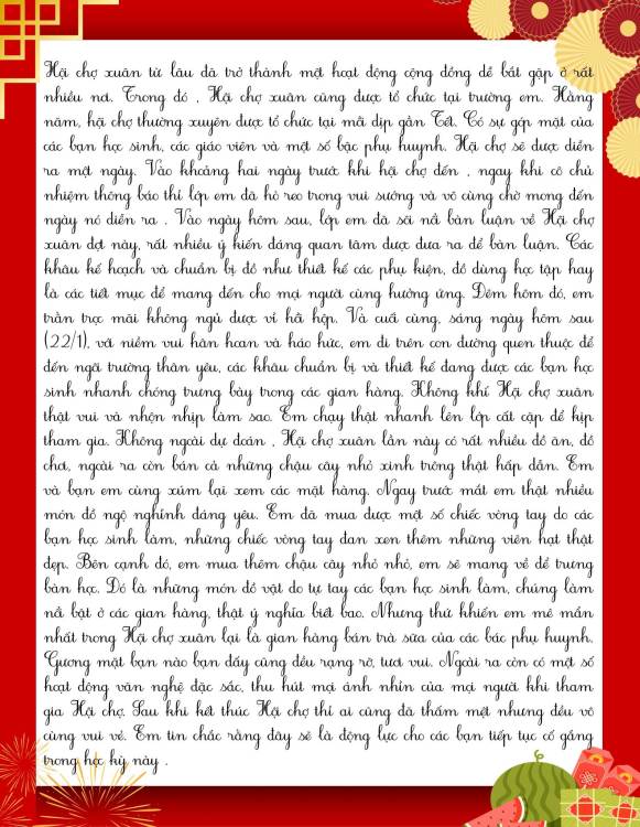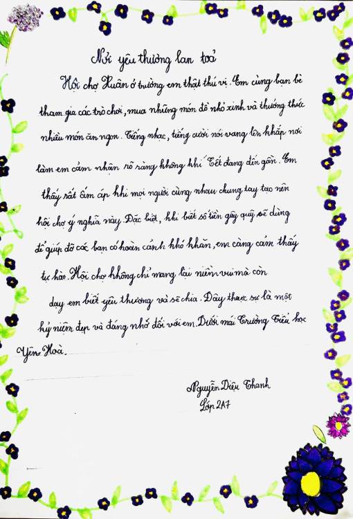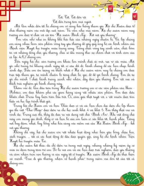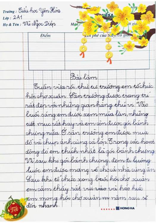 Sau hội xuân, các bạn học sinh đã viết lại những cảm xúc của mình bằng những lời văn hồn nhiên, trong sáng và rất đáng yêu. Mỗi bài viết là một mảnh ghép nhỏ, kể về niềm vui khi tham gia trò chơi dân gian, xem văn nghệ, ghé thăm các gian hàng và cùng bạn bè, thầy cô tận hưởng một ngày xuân thật đặc biệt.