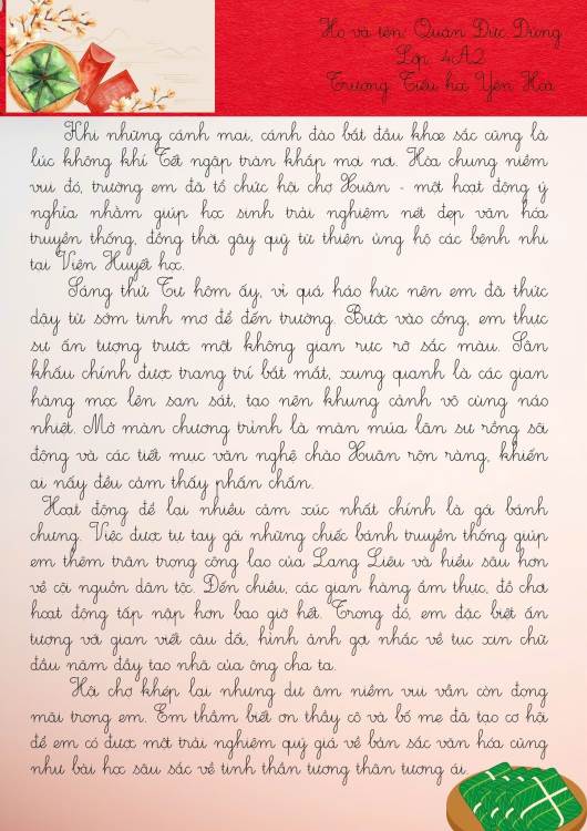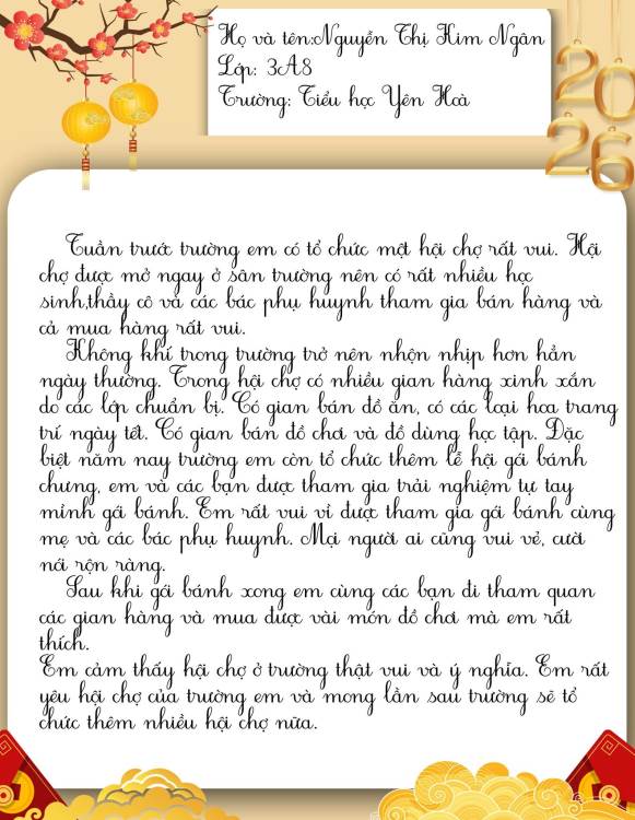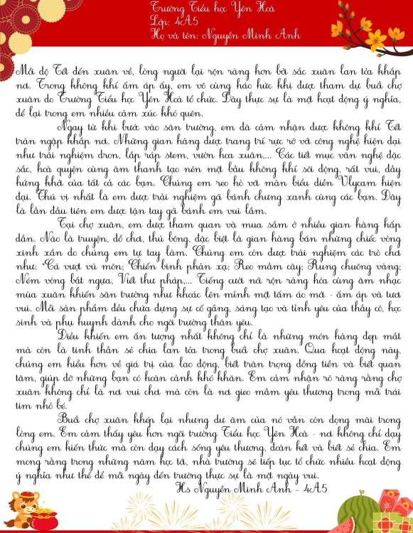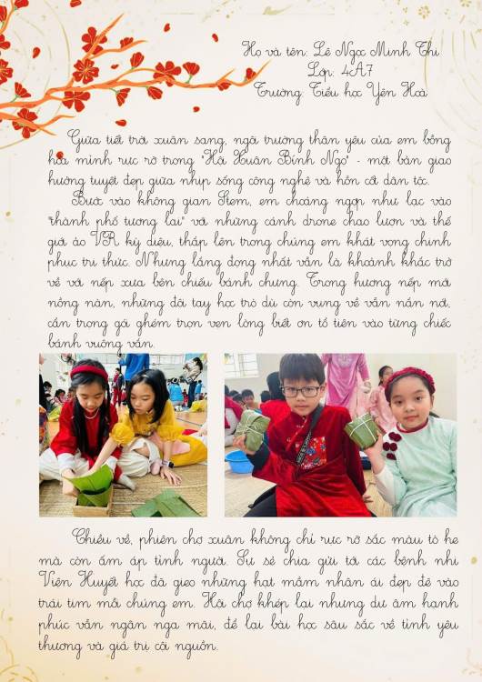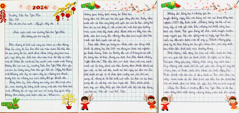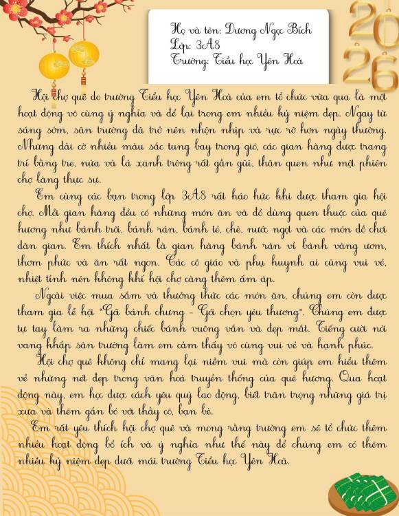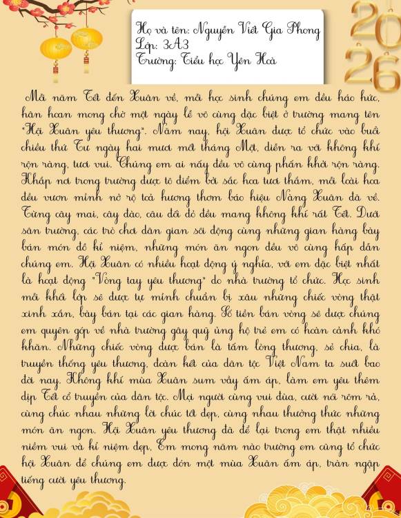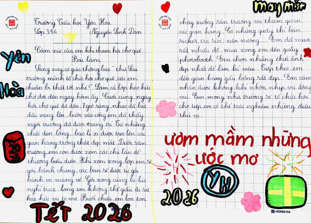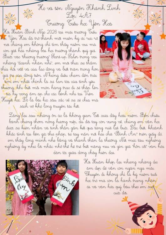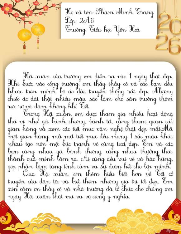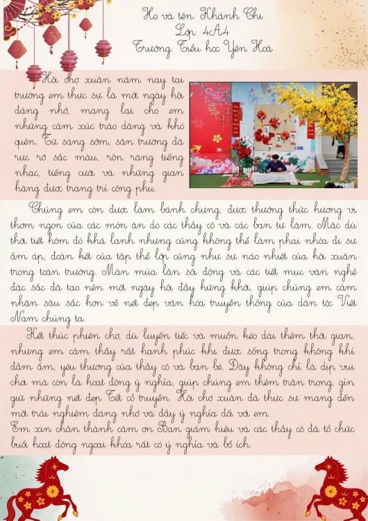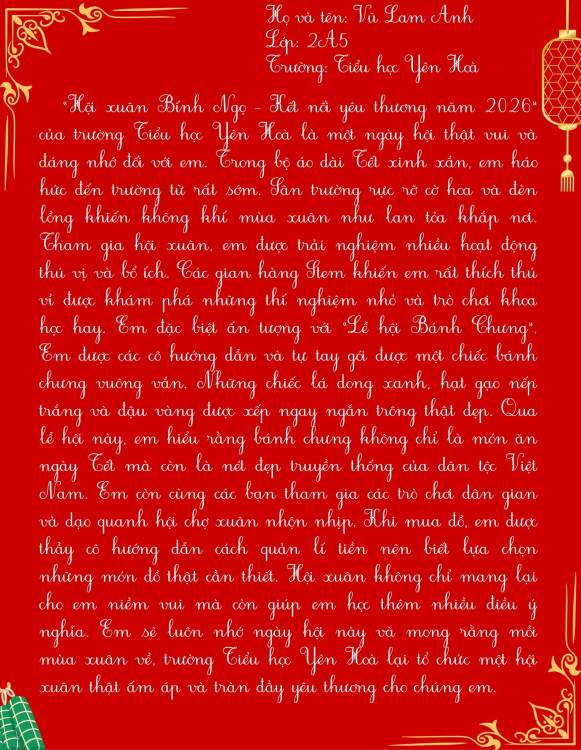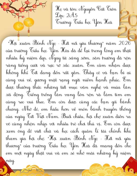 Dưới đây là những bài cảm xúc của học sinh trường Tiểu học Yên Hoà sau khi tham gia “Hội xuân Bính Ngọ – Kết nối yêu thương năm 2026”. Mời thầy cô, phụ huynh và các bạn cùng đọc để cảm nhận một mùa xuân thật vui tươi, ấm áp và đầy ý nghĩa qua góc nhìn hồn nhiên của các bạn nhỏ nhé.