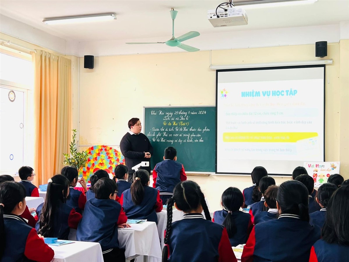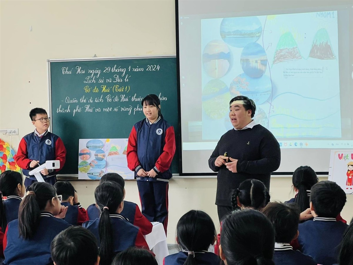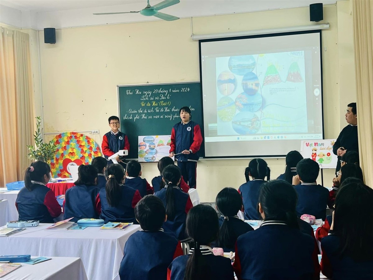 Trong chương trình GDPT 2018, môn Lịch sử và Địa lí được đánh giá là một môn học đặc thù với tính tích hợp cao, đòi hỏi giáo viên phải biết lựa chọn những kiến thức đặc trưng của bài học để giới thiệu đến học sinh và khéo léo lồng ghép giữa yếu tố địa lí và yếu tố lịch sử. Với bài học “Cố đô Huế” thuộc mạch nội dung “Đồng bằng Duyên hải miền Trung”, bằng chất giọng trầm ấm, truyền cảm và những hình thức tổ chức dạy học sáng tạo, đổi mới, thầy Duy đã từng bước dẫn dắt các học trò lớp 4A5 khám phá những công trình kiến trúc cổ, nhưng danh lam thắng cảnh nổi tiếng, những câu chuyện lịch sử hấp dẫn, huyền bí của mảnh đất cố đô cổ kính, trữ tình, nên thơ.