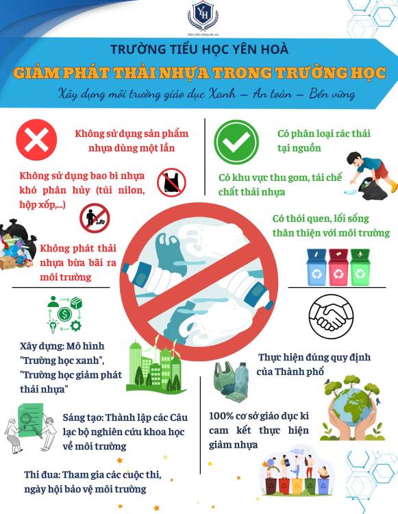 Thực hiện chỉ đạo của Thành phố Hà Nội và ngành Giáo dục về tăng cường quản lí chất thải nhựa và giảm phát thải nhựa trong các cơ sở giáo dục, Trường Tiểu học Yên Hoà tích cực triển khai nhiều hoạt động thiết thực nhằm nâng cao nhận thức và thay đổi thói quen sử dụng nhựa trong nhà trường.
