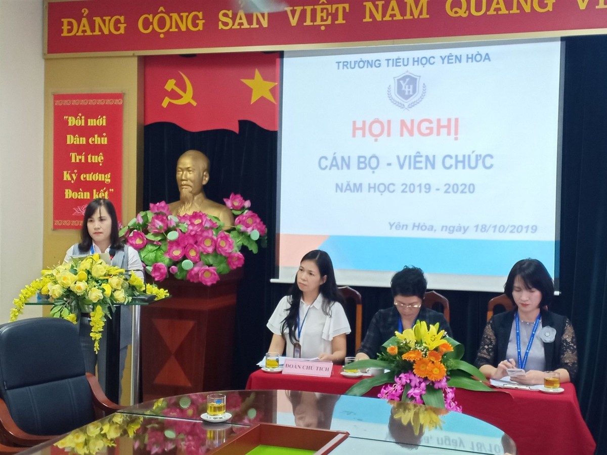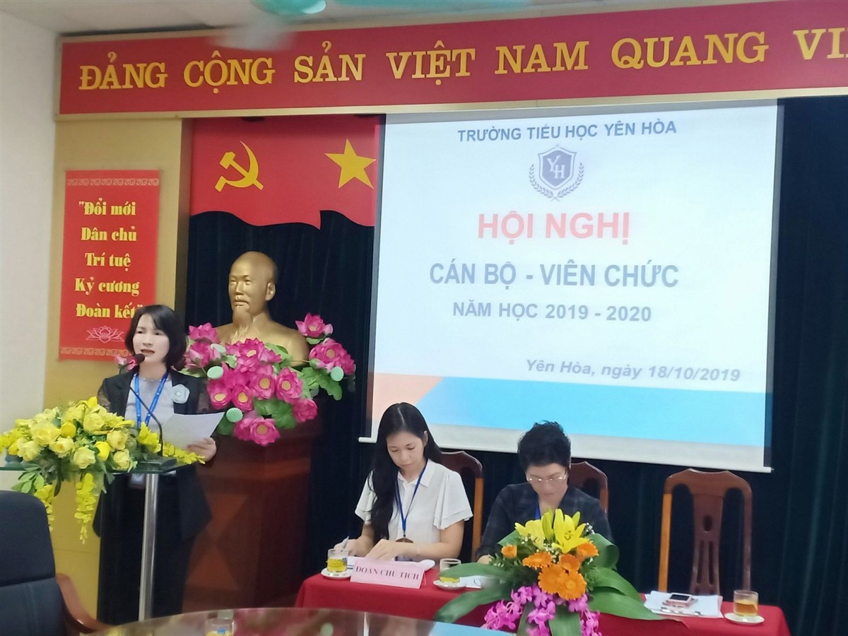 Hòa trong niềm vui hân hoan của năm học mới, năm học với chủ đề “Đổi mới căn bản – toàn diện giáo dục và đào tạo”, toàn Ngành giáo dục tiếp tục thực hiện 3 cuộc vận động lớn và triển khai phong trào thi đua “Xây dựng trường học hạnh phúc”. Sáng ngày 18 tháng 10 năm 2019 trường Tiểu học Yên Hòa long trọng tổ chức Hội nghị cán bộ, công chức, viên chức năm học 2019 – 2020 nhằm đánh giá quá trình hoạt động của toàn trường trong năm học qua đồng thời bàn về các giải pháp thực hiện một số chỉ tiêu, kế hoạch năm học 2019 - 2029