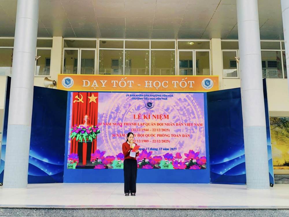 Sáng ngày 15/12/2025, Trường Tiểu học Yên Hoà đã long trọng tổ chức Lễ kỉ niệm 81 năm Ngày thành lập Quân đội Nhân dân Việt Nam (22/12/1944 – 22/12/2025) và 36 năm Ngày hội Quốc phòng toàn dân (22/12/1989 – 22/12/2025) trong không khí trang nghiêm, xúc động và đầy tự hào.