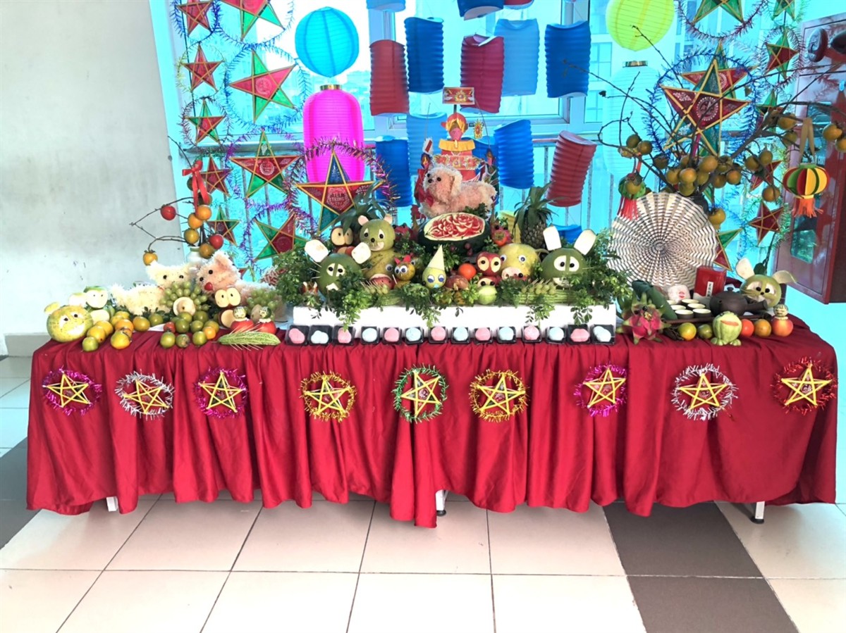 Với nhiều loại trái cây khác nhau, các bạn đã cùng nhau cắt tỉa khéo léo làm cho mâm cỗ hấp dẫn và đa dạng hơn. Chính giữa mâm cỗ là hình chú chó dễ thương được tạo hình từ quả bưởi. Quả dứa được bày biện hai bên tượng trưng cho mái nhà che chắn nắng gió. Quả bưởi tượng trưng cho hình ảnh người cha, người luôn cố gắng để gia đình có một cuộc sống ấm no, sung túc. Đây dưa hấu được trạm trổ khéo léo thành bông hoa đẹp rực rỡ tượng trưng cho người mẹ dịu hiền, đảm đang. Các loại hoa, quả còn lại được các bạn học sinh đóng góp xếp xung quanh tượng trưng cho các con trong đại gia đình. Bày thêm ấm trà, thưởng thức cùng đĩa cốm mang hương vị thanh khiết của Hà Nội thì thật tuyệt vời biết bao. Bên góc phải, chúng em đặt một bình hồng nặng trĩu quả, với màu đỏ cam và chín mọng giúp mâm cỗ trở nên bắt mắt hơn. Quả hồng còn tượng trưng cho niềm tin, sức sống.