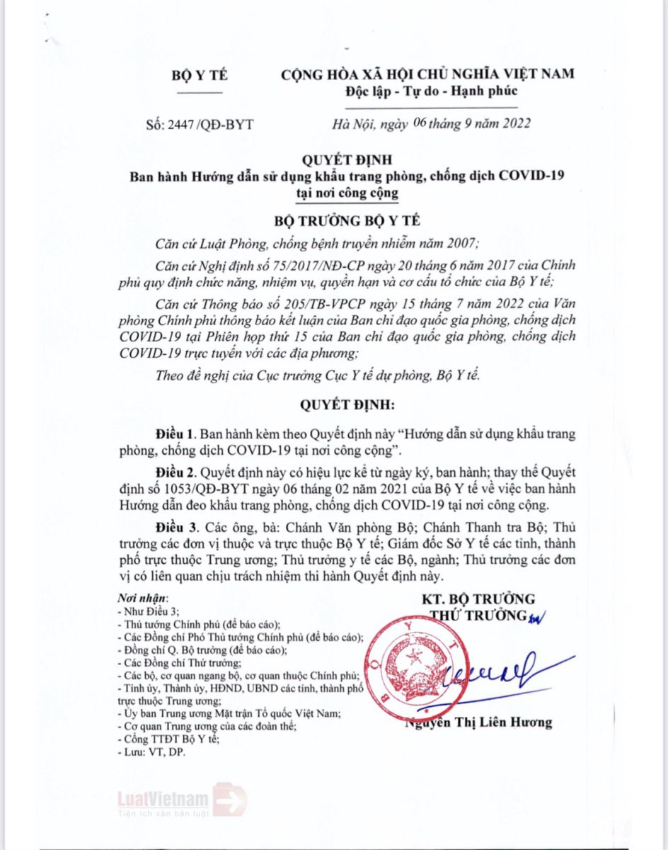 NHẰM GIÚP NGƯỜI DÂN BIẾT CÁCH SỬ DỤNG KHẨU TRANG PHÙ HỢP DIỄN BIẾN TÌNH HÌNH DỊCH BỆNH TRONG GIAI ĐOẠN MỚI, BỘ Y TẾ ĐÃ BAN HÀNH CÔNG VĂN SỐ: 2447/QĐ-BYT V/V "QUYẾT ĐỊNH BAN HÀNH HƯỚNG DẪN SỬ DỤNG KHẨU TRANG PHÒNG, CHỐNG DỊCH COVID-19 TẠI NƠI CÔNG CỘNG"