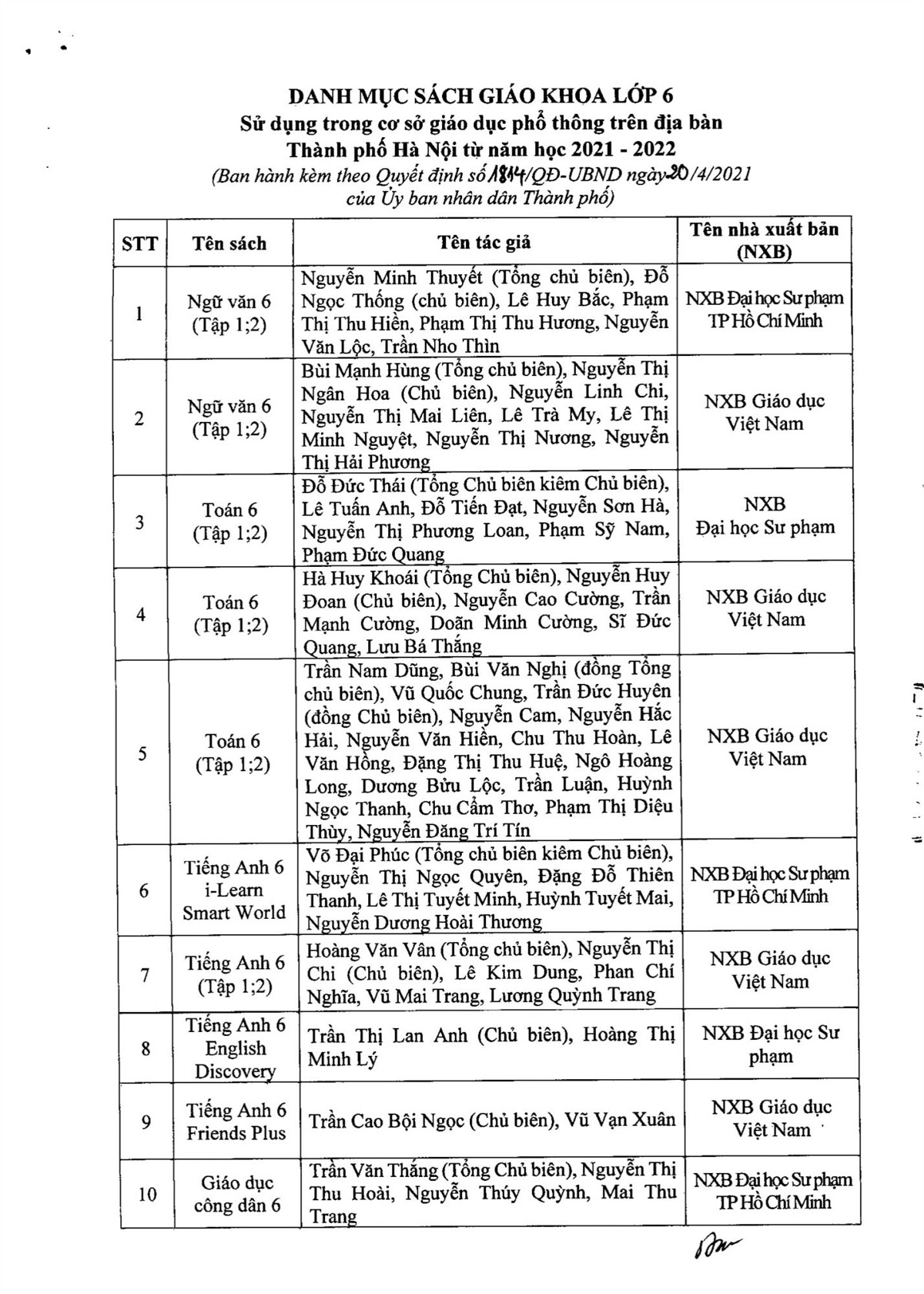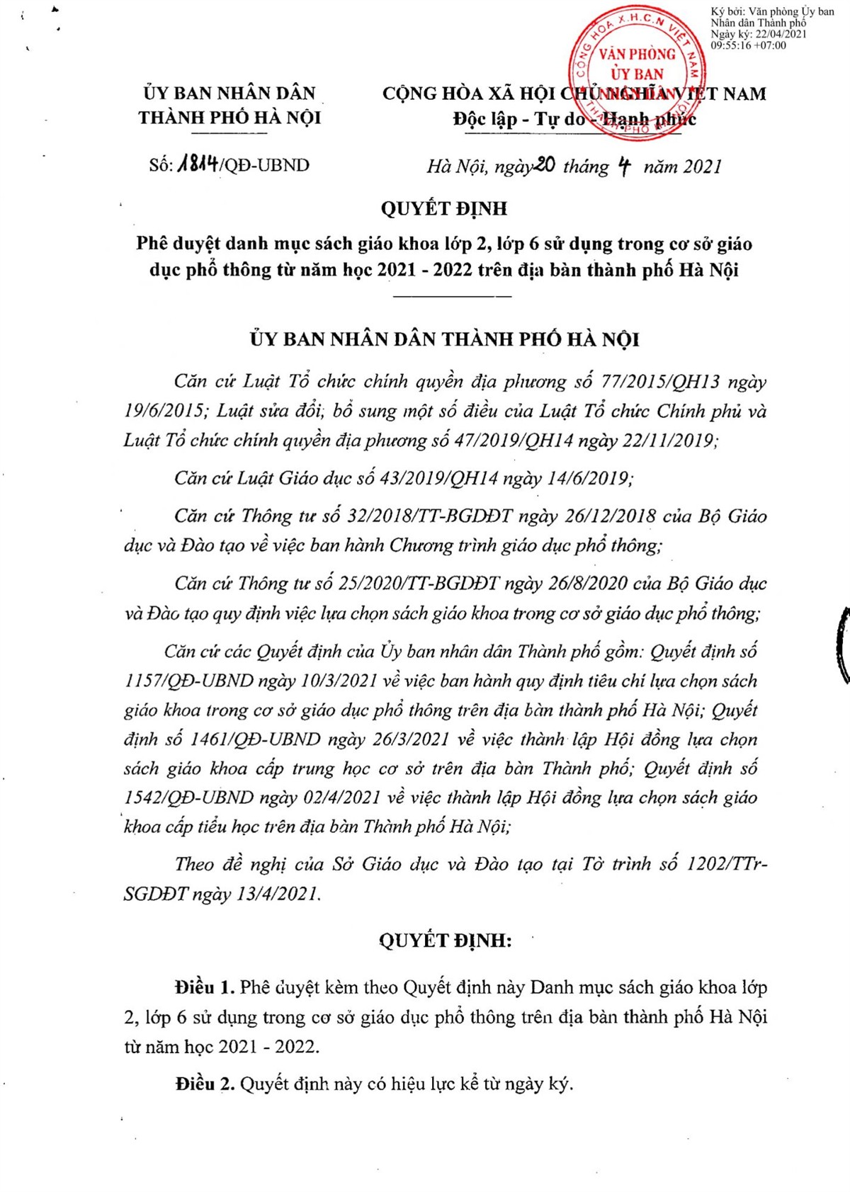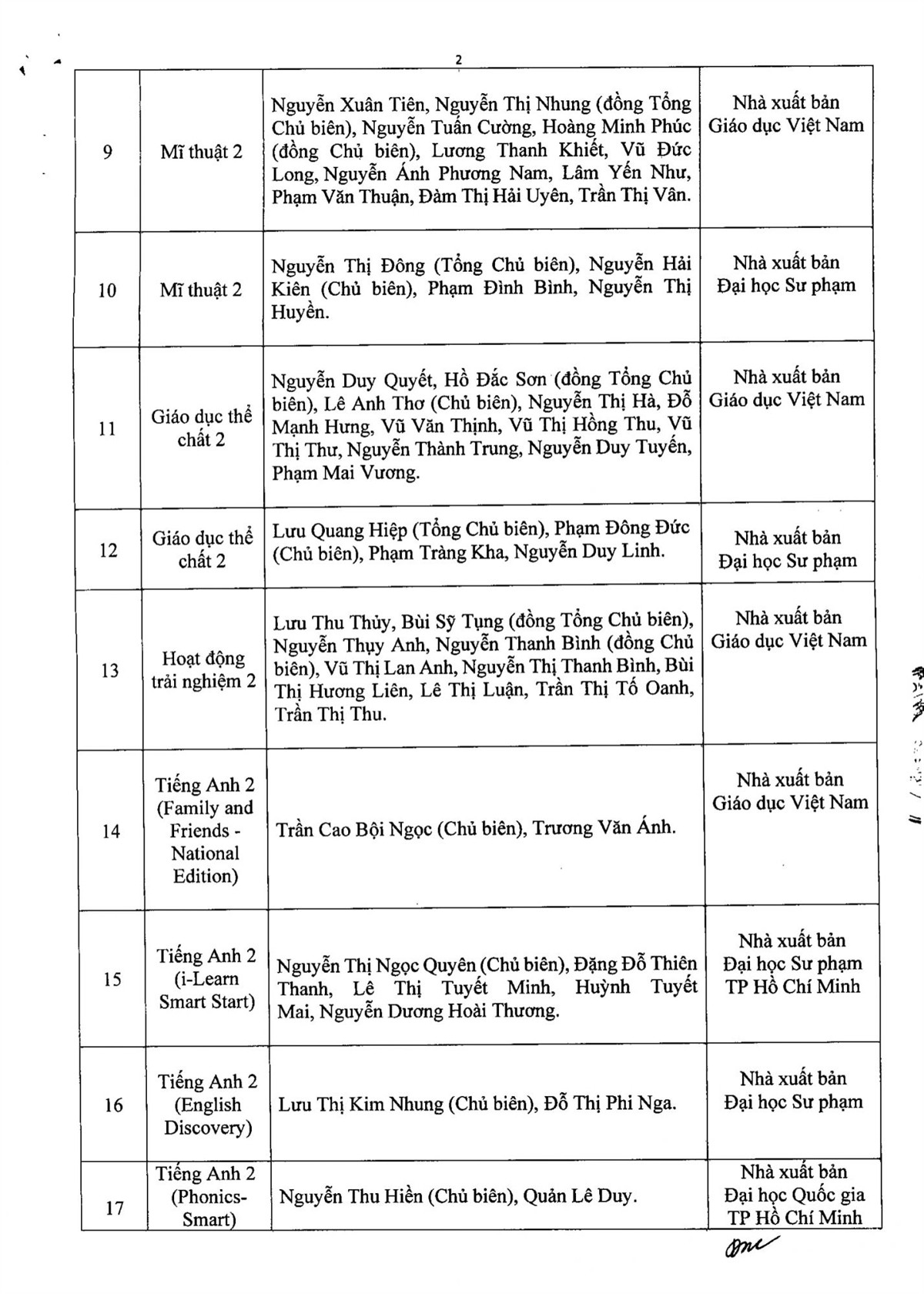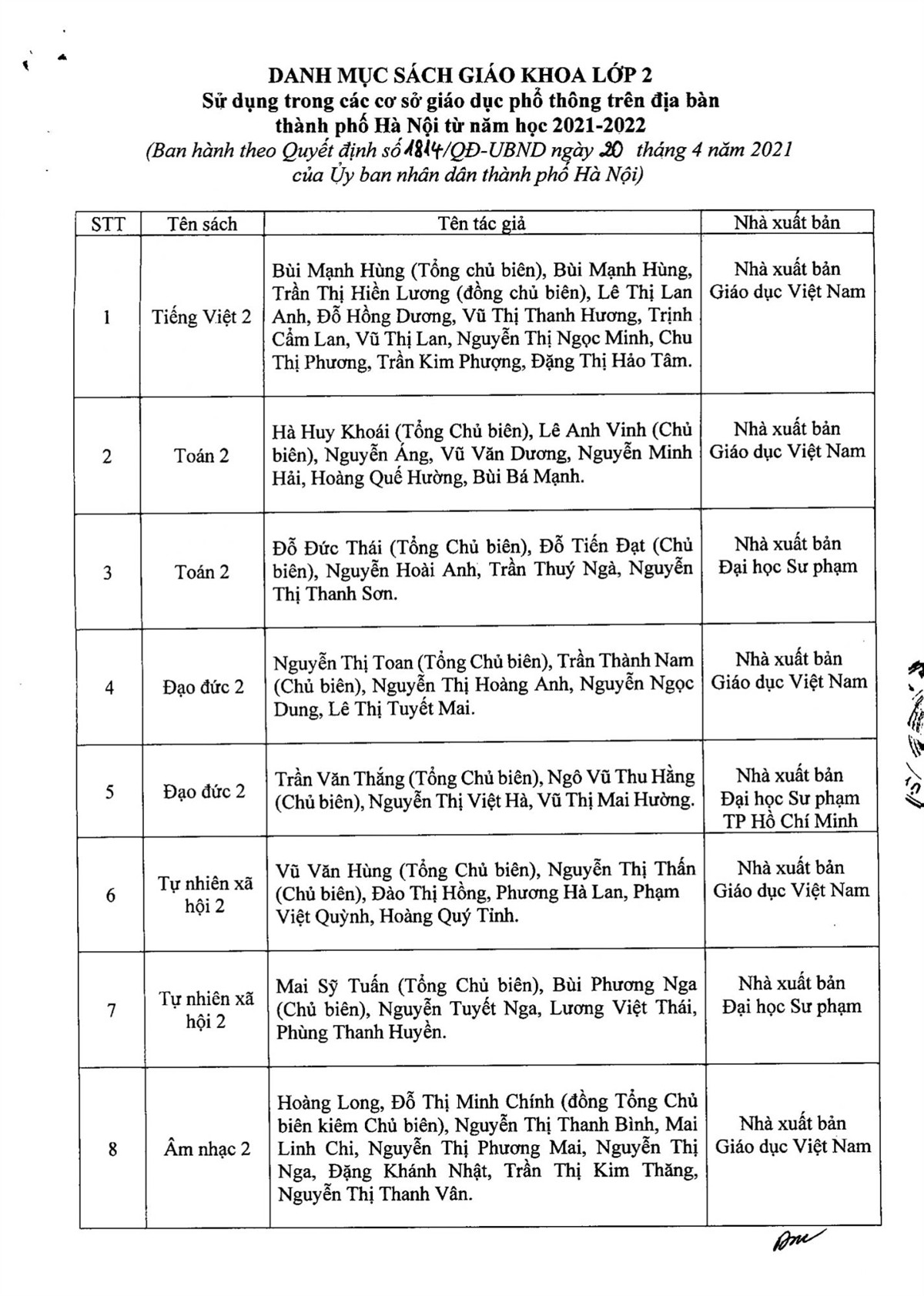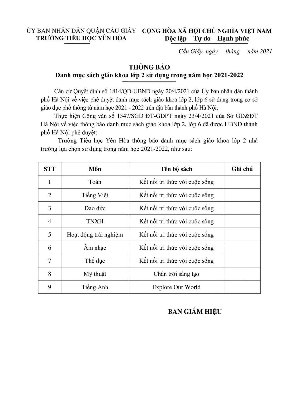THÔNG BÁO DANH MỤC SÁCH GIÁO KHOA LỚP 2 SỬ DỤNG TRONG NĂM HỌC 2021 - 2022