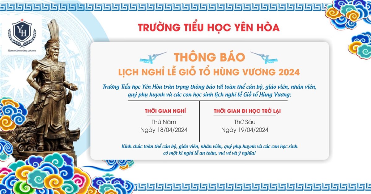 Trường Tiểu học Yên Hòa thông báo Lịch nghỉ lễ Giỗ Tổ Hùng Vương 2024