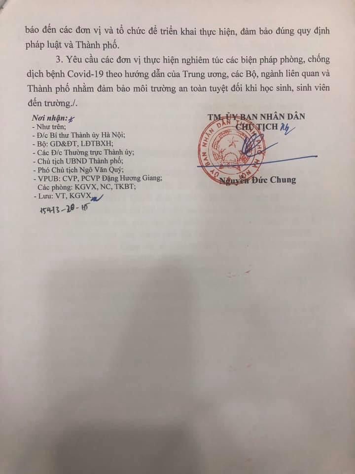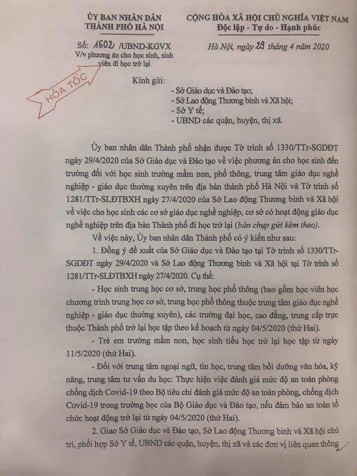 Thông báo về phương án cho học sinh, sinh viên đi học trở lại của Ủy ban nhân dân thành phố Hà Nội