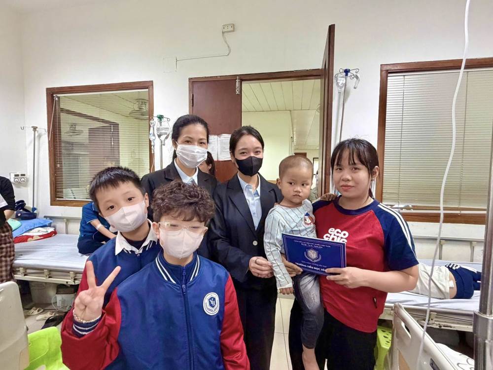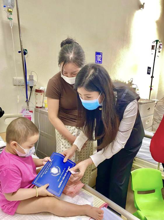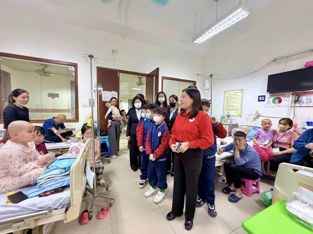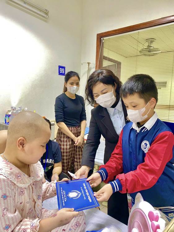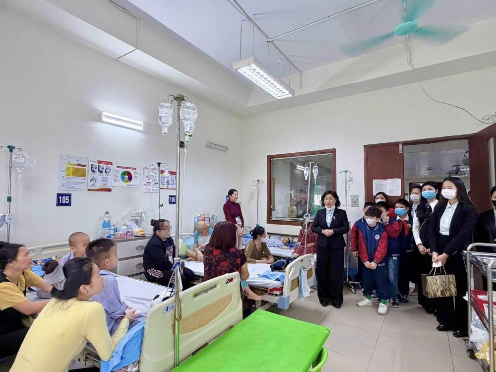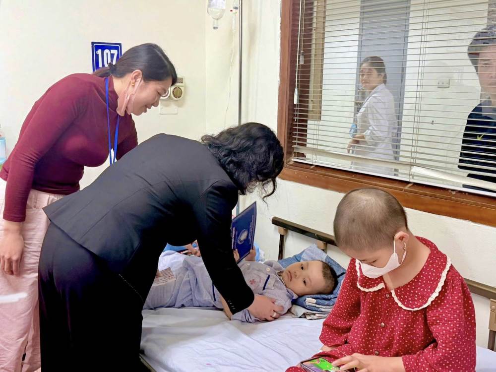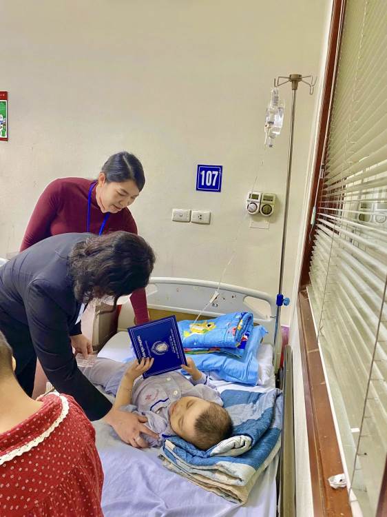 Đoàn đã ân cần thăm hỏi, gửi lời chúc sức khỏe, mong các em bệnh nhi luôn lạc quan, kiên cường, sớm hồi phục để được trở về bên gia đình đón Tết và tiếp tục đến trường.