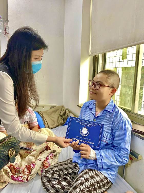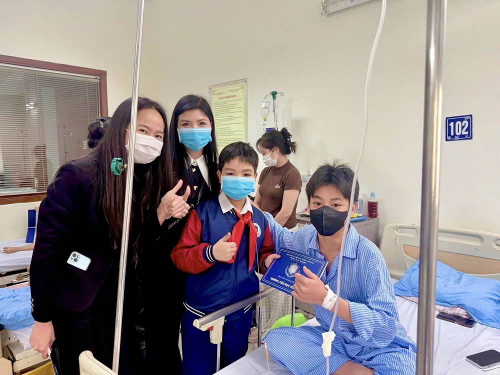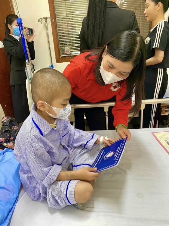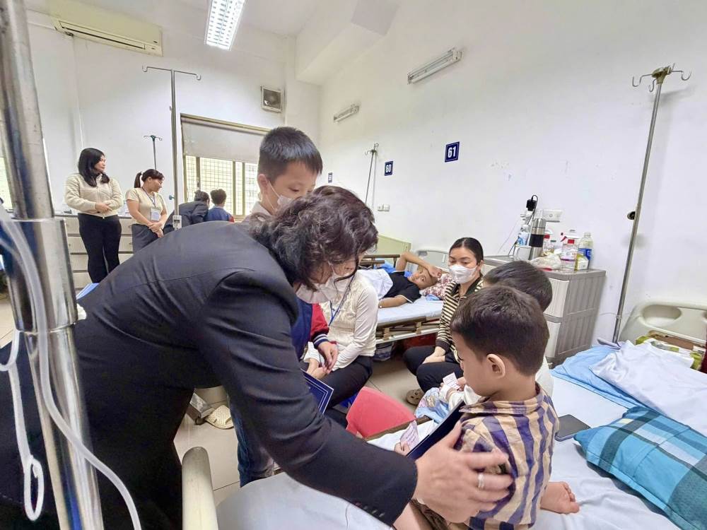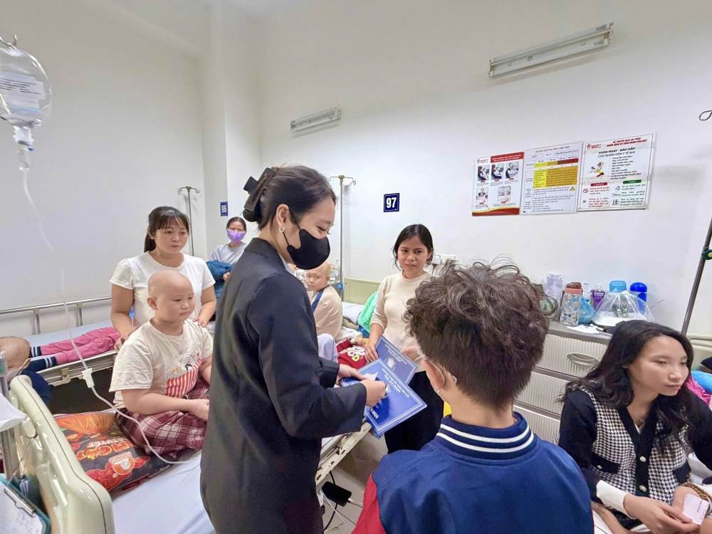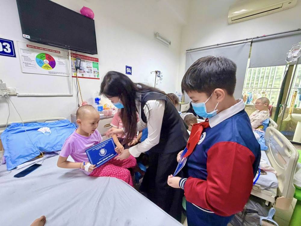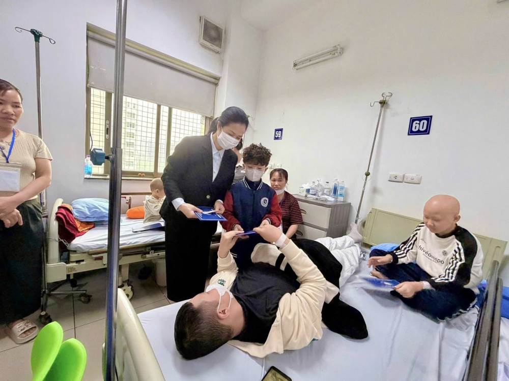 Đoàn đã ân cần thăm hỏi, gửi lời chúc sức khỏe, mong các em bệnh nhi luôn lạc quan, kiên cường, sớm hồi phục để được trở về bên gia đình đón Tết và tiếp tục đến trường.