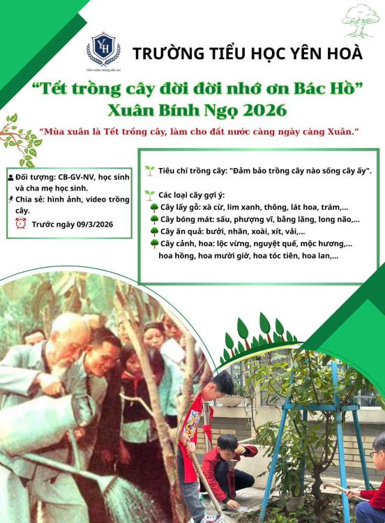 Hoà chung không khí đầu năm mới, Trường Tiểu học Yên Hoà phát động phong trào Tết trồng cây Xuân Bính Ngọ 2026 tới toàn thể cán bộ, giáo viên, nhân viên, các em học sinh và quý cha mẹ học sinh.