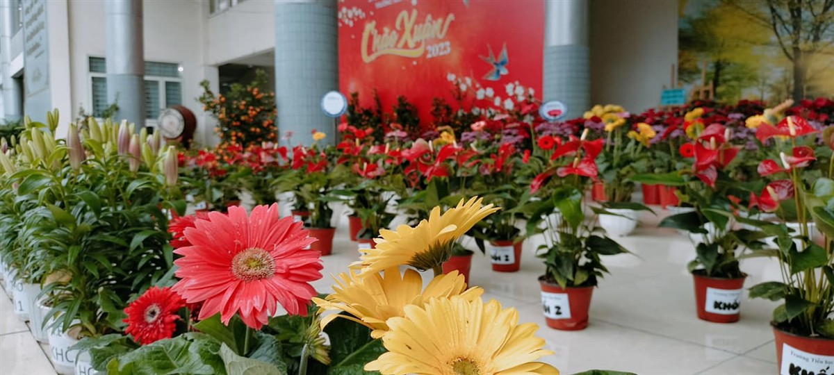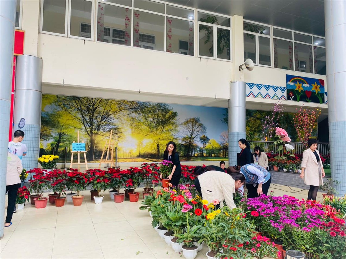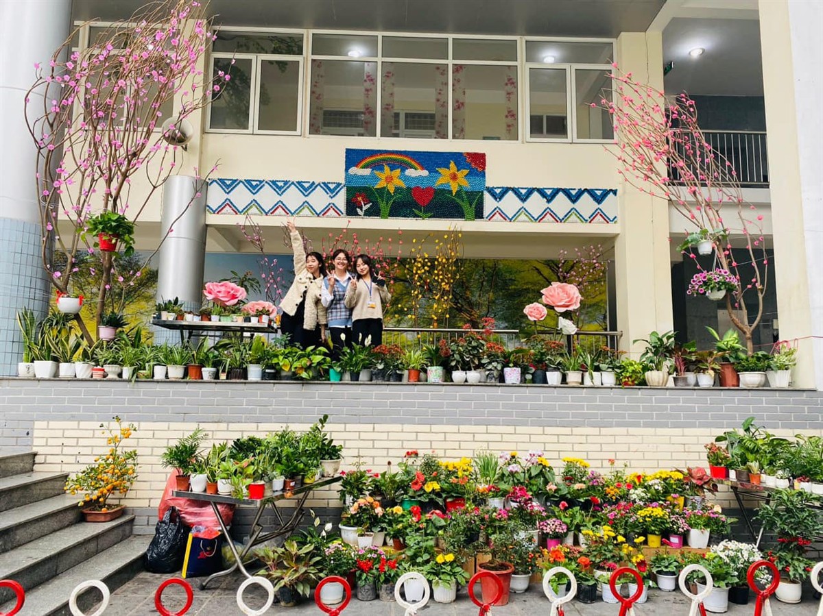 Từ chiều thứ Sáu, không khí chuẩn bị đã rộn ràng khắp nơi trong khuôn viên nhà trường. Nhờ sự ủng hộ của các bậc phụ huynh, hàng trăm cây hoa, cây cảnh đã khoe sắc rực rỡ trên khu vực sân khấu.