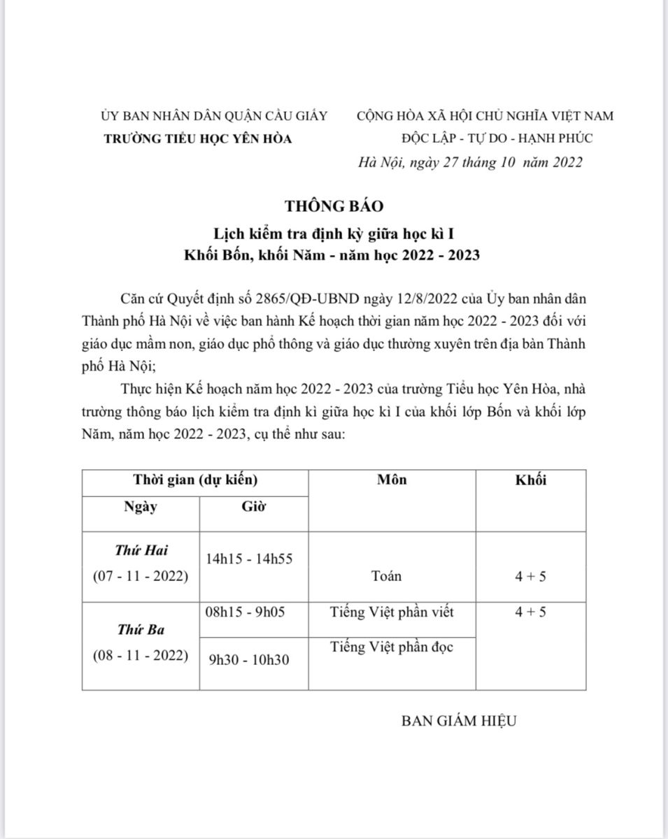 Trường Tiểu học Yên Hòa thông báo lịch kiểm tra định kì giữa học kì I đối với học sinh khối 4 và khối 5 - Năm học 2022-2023.