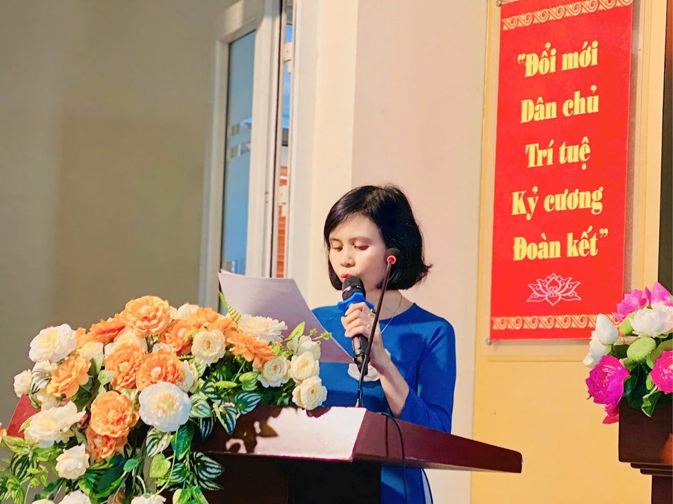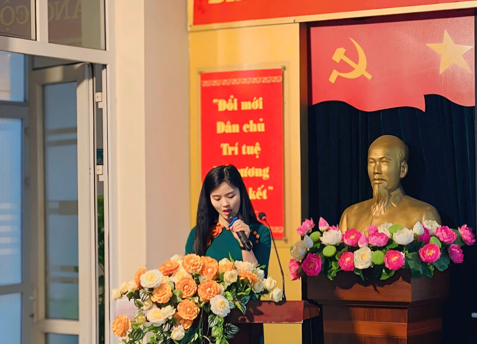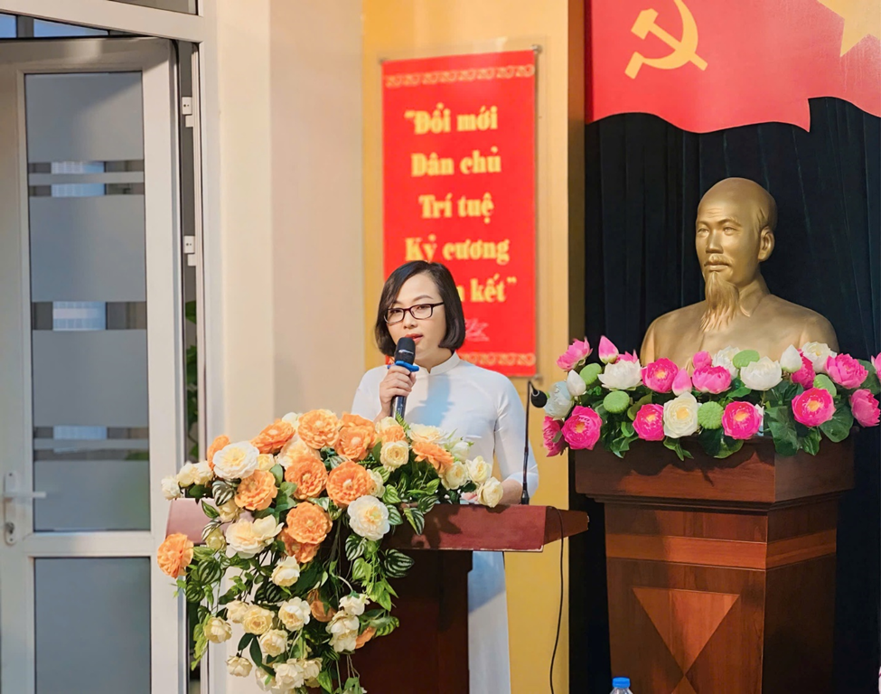 Đồng chí Đặng Thị Kim Khuê – Phó hiệu trưởng nhà trường báo cáo về việc thực hiện nhiệm vụ năm học 2023-2024 và phương hướng thực hiện các nhiệm vụ năm học 2024-2025.