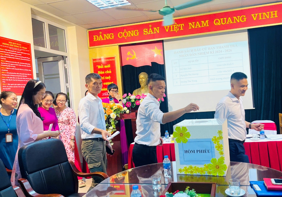 Sau khoảng thời gian làm việc nghiêm túc và khẩn trương, Hội nghị đã đi đến biểu quyết thông qua các chỉ tiêu cơ bản của nhiệm vụ năm học 2024-2025; thống nhất các kế hoạch, chỉ tiêu đề ra, hứa quyết tâm thực hiện bằng biểu quyết 100% ý kiến nhất trí và bầu được Ban thanh tra nhân dân nhiệm kì 2024 – 2026.