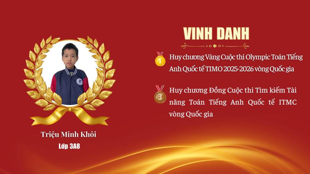 Triệu Minh Khôi – Lớp 3A8 – HCV Olympic Toán Tiếng Anh Quốc tế TIMO 2025–2026 (Vòng Quốc gia)