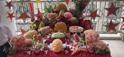 Nổi bật nhất là trái dưa hấu được tỉa thành hoa và hình Bác Hồ một cách công phu. Đây chính là thông điệp lớn nhất mà các lớp muốn gửi gắm qua mâm ngũ. Chúng ta đã được hưởng 77 mùa Trung thu độc lập như ngày hôm nay là nhờ ơn Bác. Vì vậy, mỗi mùa trăng đến, mỗi người trong chúng ta lại nhớ đến Bác, nhớ đến công lao trời bể của Bác đã giành lại độc lập, tự do cho nước Việt Nam, nhớ đến sự quan tâm, ân cần của Bác dành cho thiếu nhi và càng thêm kính trọng Bác Hồ.