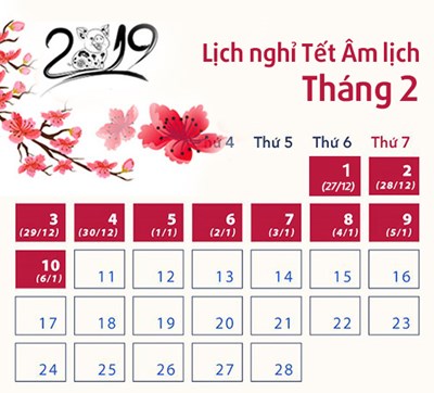 Nghỉ Tết 10 ngày liên tục (kể cả ngày thứ Bảy và Chủ nhật), từ ngày 01/2/2019 (Thứ sáu, ngày 27 tháng Chạp năm Mậu Tuất) đến hết ngày 10/2/2019 (Chủ nhật, ngày mùng 06 tháng Giêng năm Kỷ Hợi).