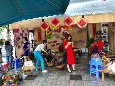 Các cô giáo khối 1 tất bật để có một gian hàng tràn đầy sắc xuân