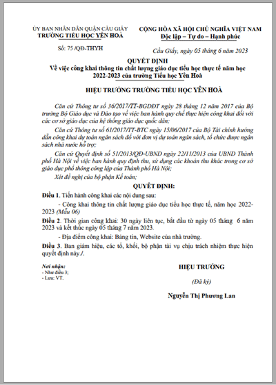 Chúc cho trường Tiểu học Yên Hòa đạt nhiều thành tích cao trong học kì II, hoàn thành xuất sắc nhiệm vụ năm học 2023 – 2024.