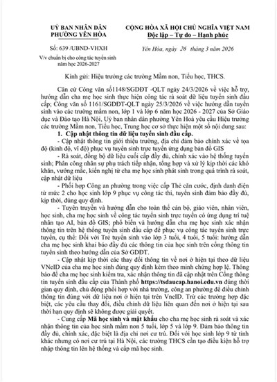 Trường Tiểu học Yên Hòa thông báo kế hoạch tuyển sinh vào lớp 1 năm học 2016 – 2017 như sau: