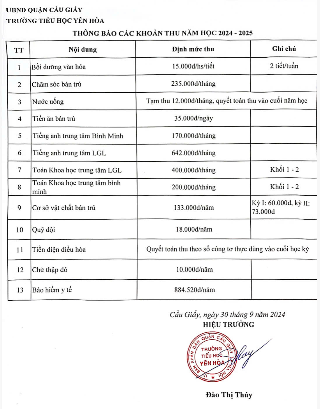 THÔNG BÁO CÁC KHOẢN THU NĂM HỌC 2024-2025