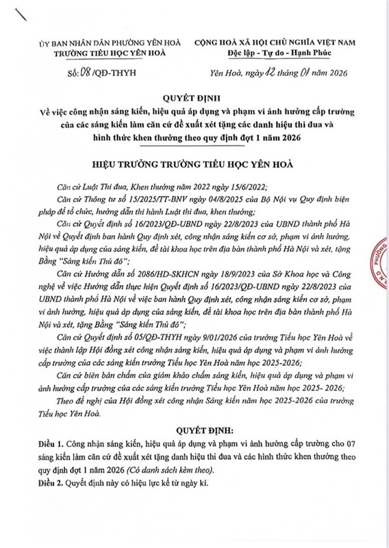 QUYẾT ĐỊNH CÔNG NHẬN SÁNG KIẾN, HIỆU QUẢ ÁP DỤNG VÀ PHẠM VI ẢNH HƯỞNG CẤP TRƯỜNG CỦA CÁC SÁNG KIẾN LÀM CĂN CỨ ĐỀ XUẤT XÉT TẶNG CÁC DANH HIỆU THI ĐUA VÀ HÌNH THỨC KHEN THƯỞNG THEO QUY ĐỊNH ĐỢT 1 NĂM 2026